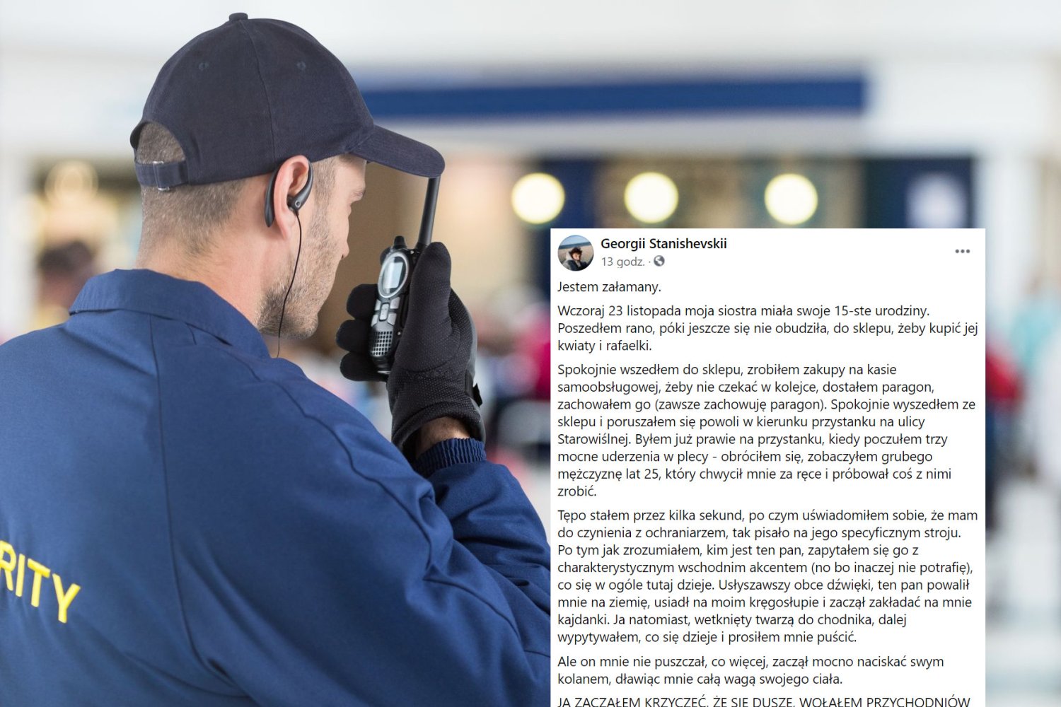 Pan Georgii z Krakowa wyszedł rano do sklepu po słodycze dla swojej 15-letniej siostry na urodziny, a po południu wrócił z obdukcją - pobity i sterroryzowany przez ochroniarza. Oddajemy głos panu Georgijowi i zamieszczamy poniżej całą relację, którą podzielił się na Facebooku.