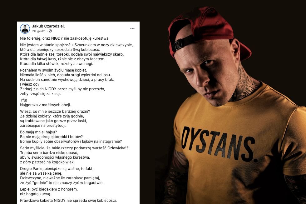 Jak dowiadujemy się następnie z pouczającego wpisu, kobiety pracujące w branży seksualnej "oddają swój największy skarb dla ładniejszej torebki" (a nie - na przykład - świadczą usługi, na które jest popyt, by wynająć mieszkanie i opłacić rachunki). Nie śmiemy gdybać, jaki był największy skarb Jakuba Czarodzieja, zanim wybrał kompromitującą karierę coacha z netu, ale najwyraźniej oddał go on dla fajnej czapki i dużej liczby bluz.