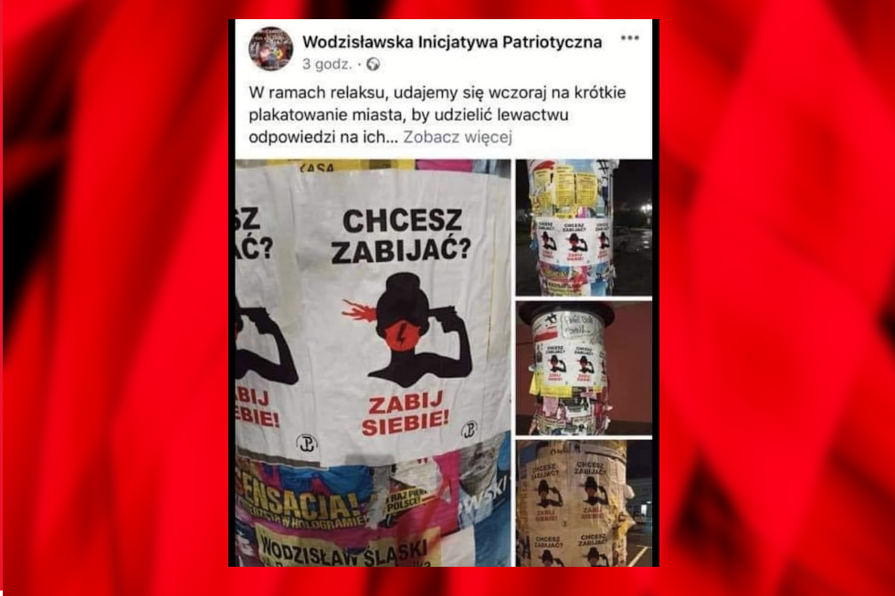 "Chcesz zabijać? Zabij siebie!" - głosi ciepły, rodzinny plakat ukazujący, że zwolennikom zakazu aborcji chodzi przede wszystkim o Życie, a nie o dręczenie kobiet. Towarzyszy mu grafika przedstawiająca kobietę strzelającą sobie w bok głowy.