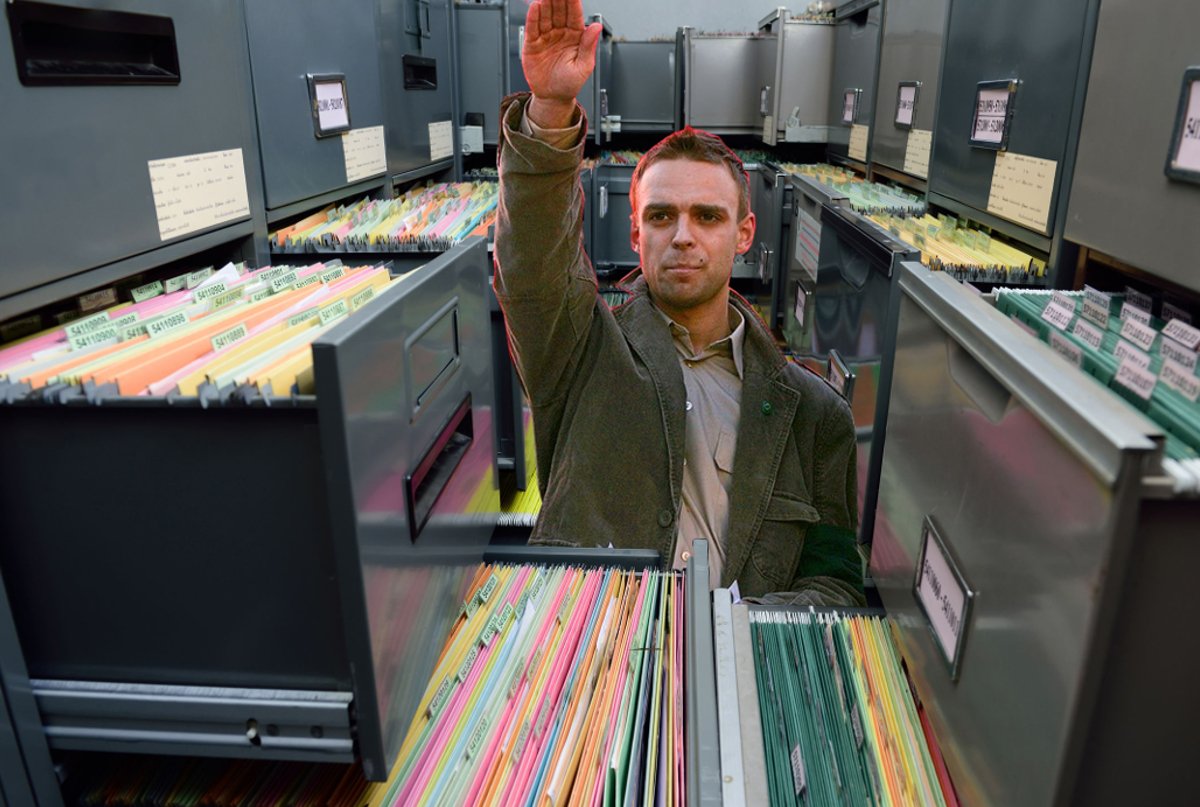 Jedyne na co narzekają nowi współpracownicy Greniucha, to to, że czasem zakłóca panującą w archiwum ciszę i sięgając po teczkę z papierami wykrzykuje nagle "Sieg hei-- znaczy salut rzymski, salut rzymski!".