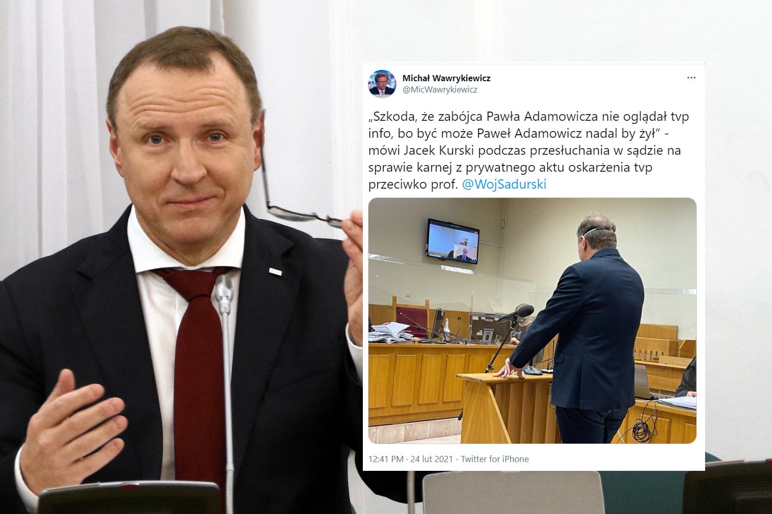 W Warszawie toczy się proces wytoczony przez Telewizję Polską profesorowi Wojciechowi Sadurskiemu za "naruszenie dóbr osobistych". TVP nie spodobała się opinia Sadurskiego o zaszczuciu zamordowanego prezydenta Gdańska przez rządowe media. Dziś przed sądem zeznawał Jacek Kurski. I zeznał, że TVP mogłaby ocalić życie prezydenta, gdyby zabójca ją oglądał.