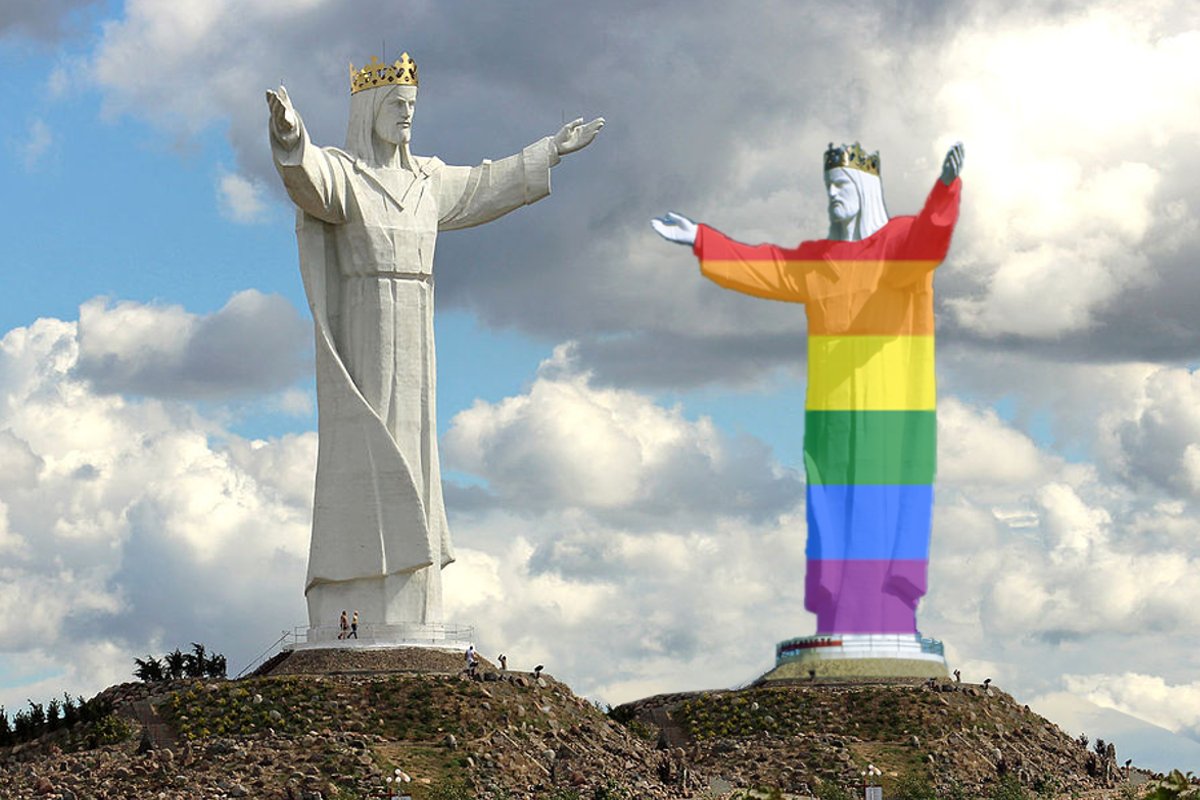 Figura, oprócz barw LGBT, jest bliźniaczo podobna do oryginalnego Jezusa ze Świebodzina. Również przedstawia mesjasza w koronie z wyciągniętymi w górę rękami i tak samo nikogo nie obraża.