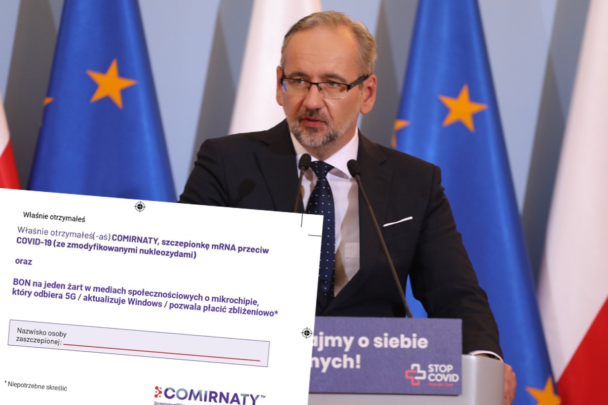 O ważnej poprawce do Narodowego Programu Szczepień poinformował minister zdrowia Adam Niedzielski. Od dziś każdy zaszczepiony pierwszą dawką szczepionki Comirnaty, Modena i Astra Zeneca otrzyma bardzo istotny druk. Będzie to bon na wrzucenie jednego żartu o 5G i chipie na Facebooka.