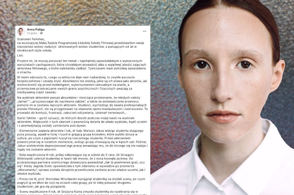 Jakiś czas temu słyszeliśmy o molestowaniu i mobbingu aktorek w krakowskim teatrze Bagatela, a potem w Gardzienicach. Do niedawna większość Polski nie miała za to pojęcia za to, co wyrabia się na zajęciach w łódzkiej Filmówce. No to teraz wszyscy wiemy - bo aktorka Anna Paliga, absolwentka PWSFTviT, właśnie to opisała. Tak konkretnie. Z nazwiskami.