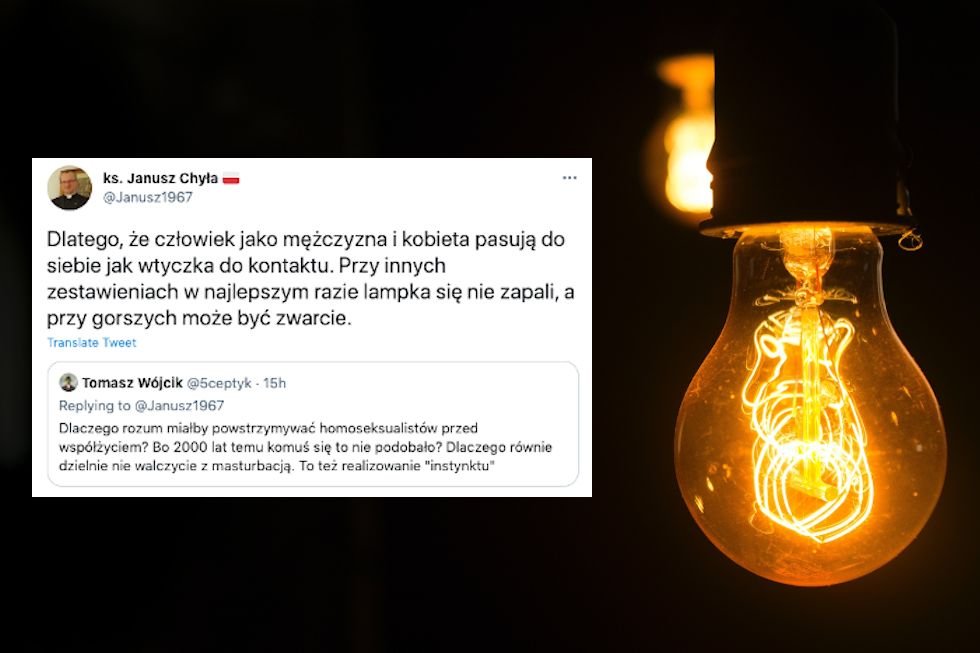 - Dlatego, że człowiek jako mężczyzna i kobieta pasują do siebie jak wtyczka do kontaktu. Przy innych zestawieniach w najlepszym razie lampka się nie zapali, a przy gorszych może być zwarcie - odparł ksiądz Chyła, który zna się nie tylko na Ewangelii, ale i na elektryce.