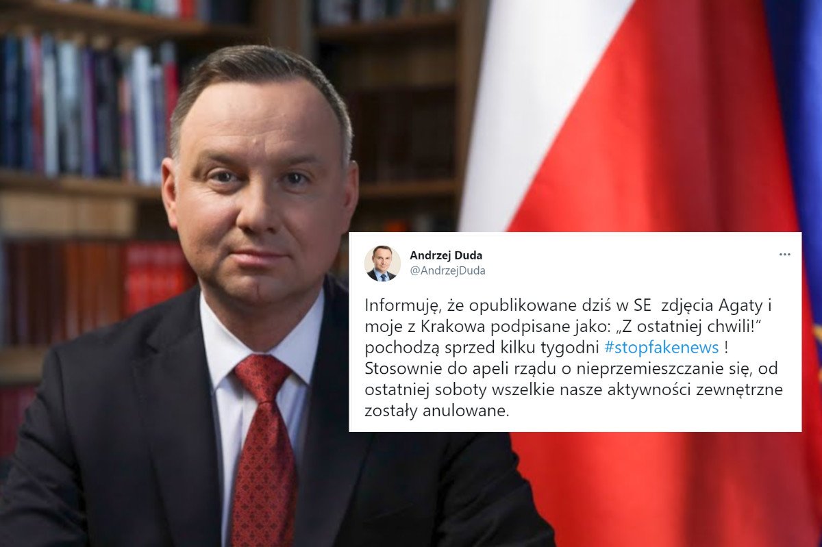 - Informuję, że opublikowane dziś w SE zdjęcia Agaty i moje z Krakowa podpisane jako: „Z ostatniej chwili!” pochodzą sprzed kilku tygodni #stopfakenews ! Stosownie do apeli rządu o nieprzemieszczanie się, od ostatniej soboty wszelkie nasze aktywności zewnętrzne zostały anulowane - ogłosił narodowi prezydent w pierwszym od dawna tweecie, w którym nie pojawił się Lewy.