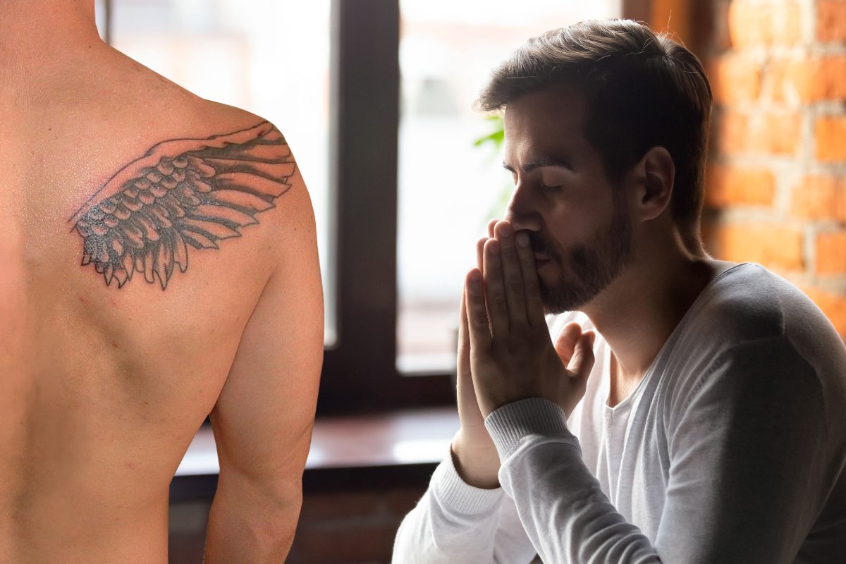 Wybrał wzór skrzydła anioła, które zażyczył sobie na prawej łopatce. Nie pamięta, dlaczego to było akurat skrzydło anioła, bo nie jest specjalnie wierzący, ani czy na lewej łopatce miało być drugie. W każdym razie od tego czasu jego plecy pokrywał szpecący wzór.