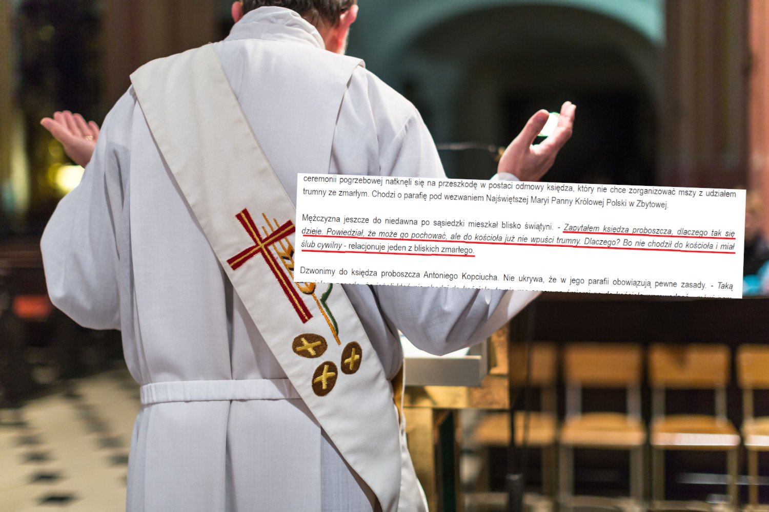 Ksiądz zapytany przez portal o powody takiej decyzji powiedział, że "taką przyjął zasadę, że jeżeli ktoś nie chodzi do kościoła, to nie ma sensu po śmierci go do kościoła wprowadzać".