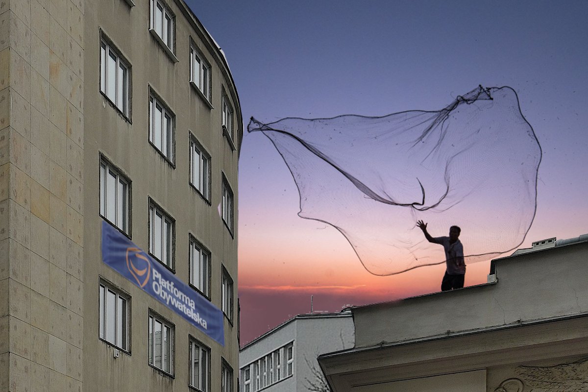 Od kilku miesięcy na dachach budynków obok biur Platformy Obywatelskiej i .Nowoczesnej w Warszawie co wieczór pojawiał się tajemniczy mężczyzna z siecią rybacką. Długo udawało mu się utrzymać anonimowość, ale ostatnio stracił czujność i został rozpoznany. To lider ruchu Polska2050 - Szymon Hołownia.