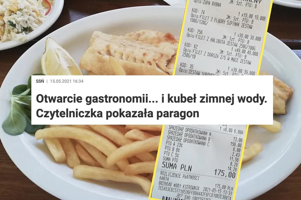 - Zachęceni zniesieniem obostrzeń wyskoczyliśmy do Gdańska, gdzie oczywiście trzeba zaliczyć obowiązkową rybkę przy plaży - powiedziała portalowi pani Ewelina. Jak wynika z jej paragonu, zapłaciła 175 zł za jedną zupę rybną, trzy filety (pewnie z frytkami), zestaw surówek, herbatę, wodę i sok.