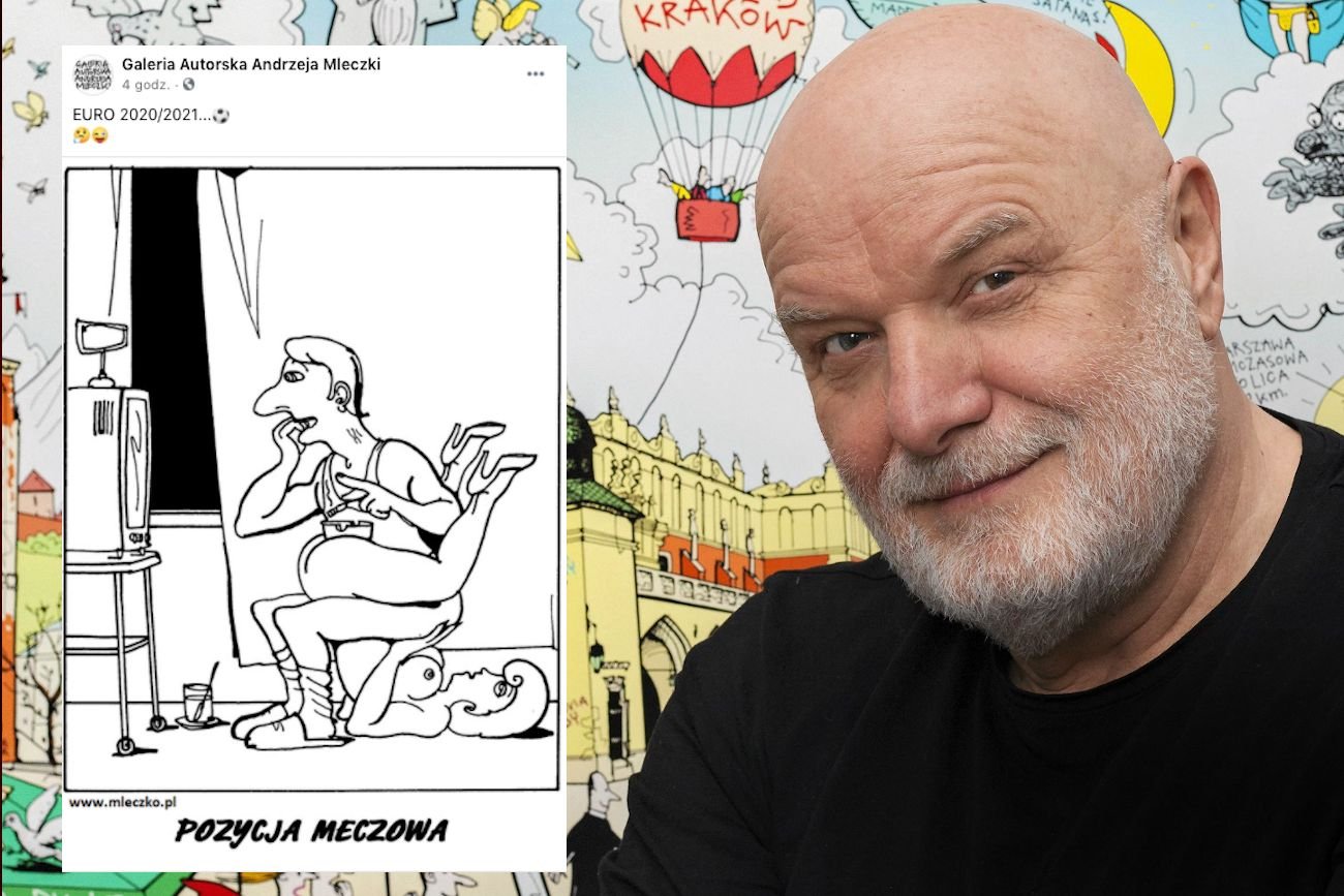 Na czym polega Euro? Wiadomo, na tym, że panowie siedzą tak zapatrzeni w telewizor, że nie obchodzi ich nawet babska dupa. Tak da się streścić przekomiczny żart, który autorska galeria Andrzeja Mleczki postanowiła przypomnieć z okazji ruszającego właśnie turnieju.