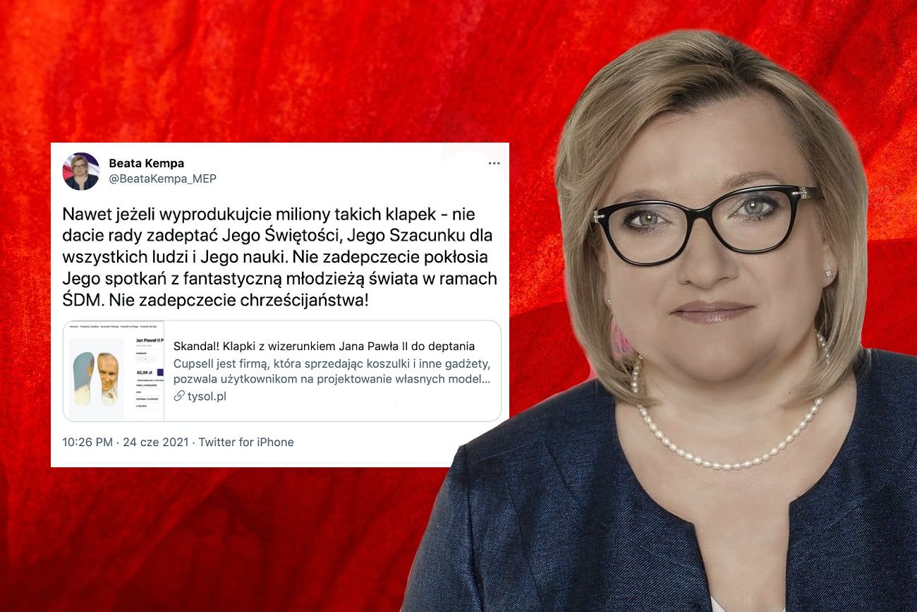 O co dziś inba na prawicowym Twitterze? Już wiemy: tym razem o klapki z papieżem Polakiem. Europosłanka Beata Kempa dostrzegła na jednym z prawicowych portali artykuł, w którym omawiana jest linia konfekcji z wizerunkiem Jana Pawła II.
