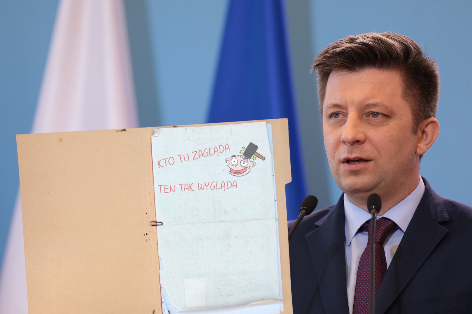 - Dla efektu odstraszającego na aktach zostanie zamieszczony odrażający i groteskowy rysunek szkaradnej twarzy - podkreślił Michał Dworczyk. - Żaden szpieg nie zechce narazić się na śmieszność i od razu po otwarciu teczki zostawi tajne akta w spokoju.