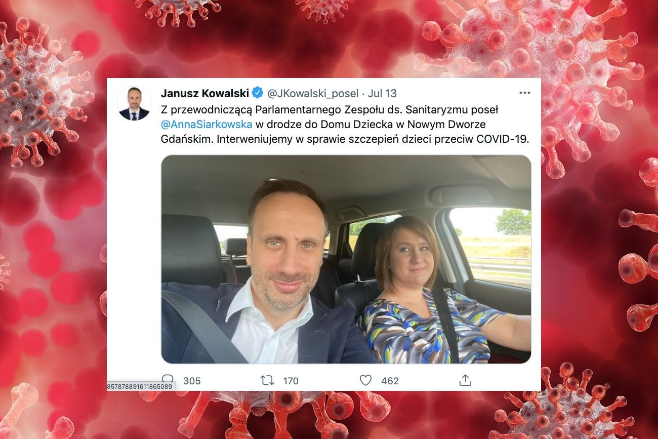 Co jest powinnością posłów na Sejm RP w czasach pandemii? Otóż wycieczka do Nowego Dworu Gdańskiego, by tam bronić dzieci przed otrzymaniem szczepionki chroniącej przed COVID-19. Tak przynajmniej wynika z przejmującej historii, którą na Twitterze opublikowali posłowie PiS Janusz Kowalski i Anna Maria Siarkowska.