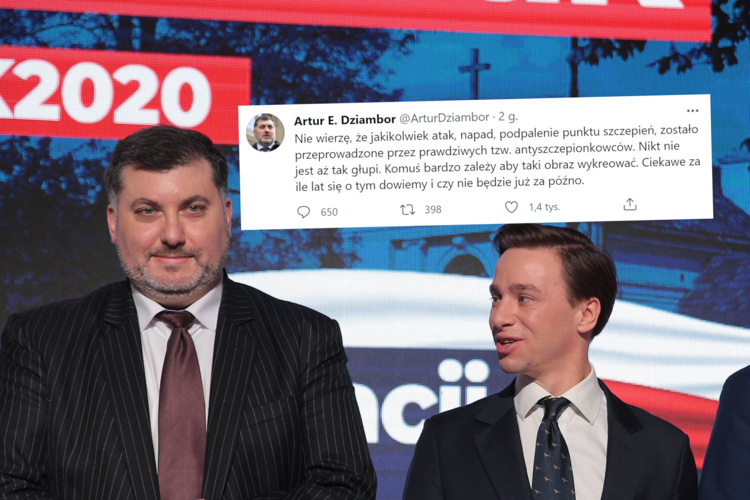 - Nie wierzę, że jakikolwiek atak, napad, podpalenie punktu szczepień, zostało przeprowadzone przez prawdziwych tzw. antyszczepionkowców - ocenił Artur Dziambor.