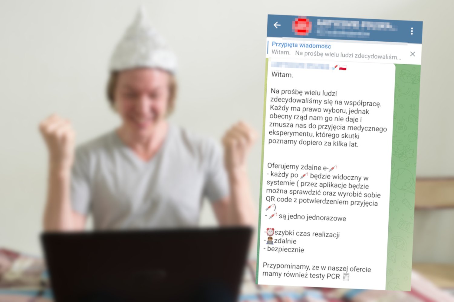 OK, to chyba nie jest najlepsza promka, jaką można znaleźć w internecie. W komunikatorze Telegram można znaleźć szurskie konto, które zachęca do zakupu podrobionych zaświadczeń o szczepieniu. Profil prowadzony w języku polskim obiecuje, że sfałszowane dowody są widoczne w elektronicznej ewidencji. Ceny sięgają 2 tys. zł za dowód na Pfizera.
