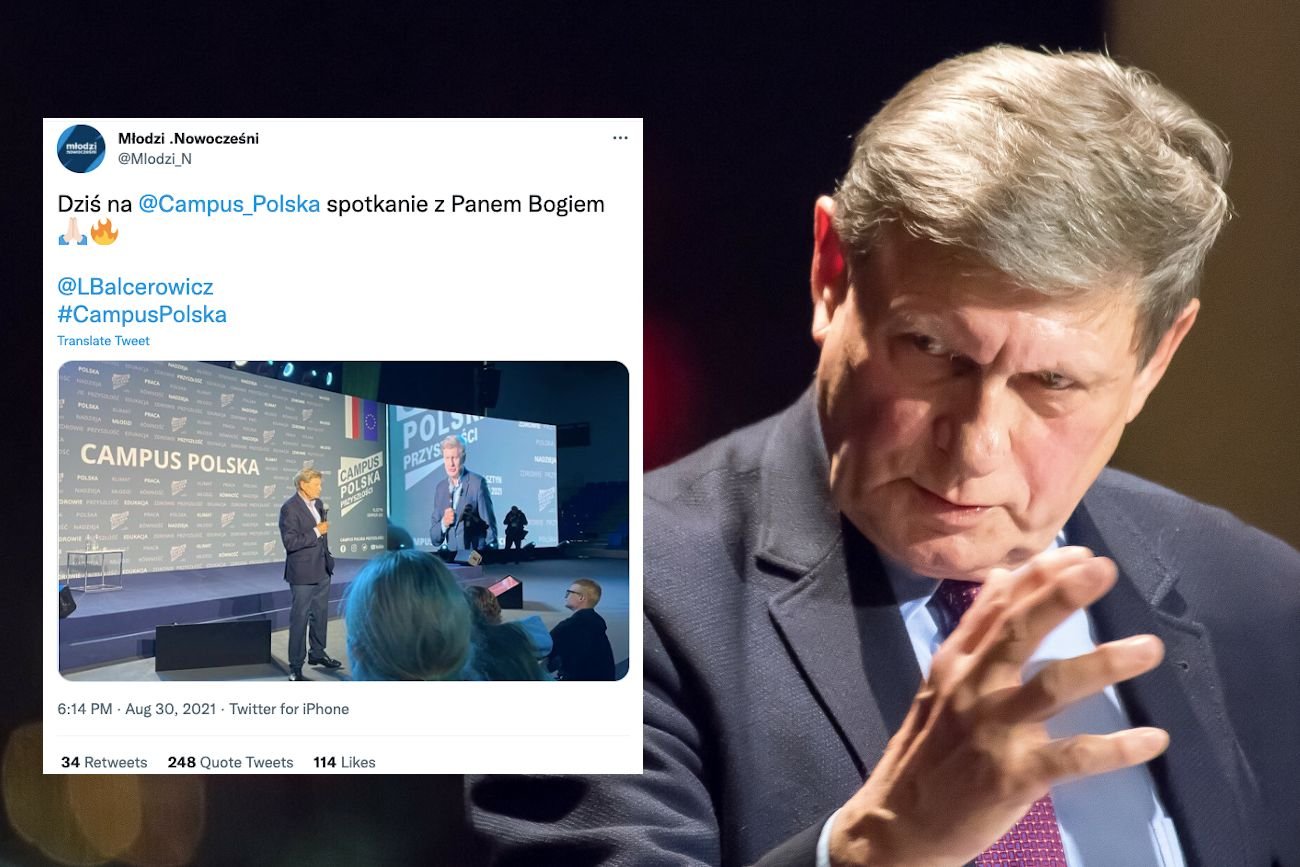 "Dziś na Campus Polska spotkanie z Panem Bogiem" - napisali przedstawiciele młodzieżówki Nowoczesnej, dodając do tego emoji ognia i zbicia piątki, która wygląda trochę jak amen.