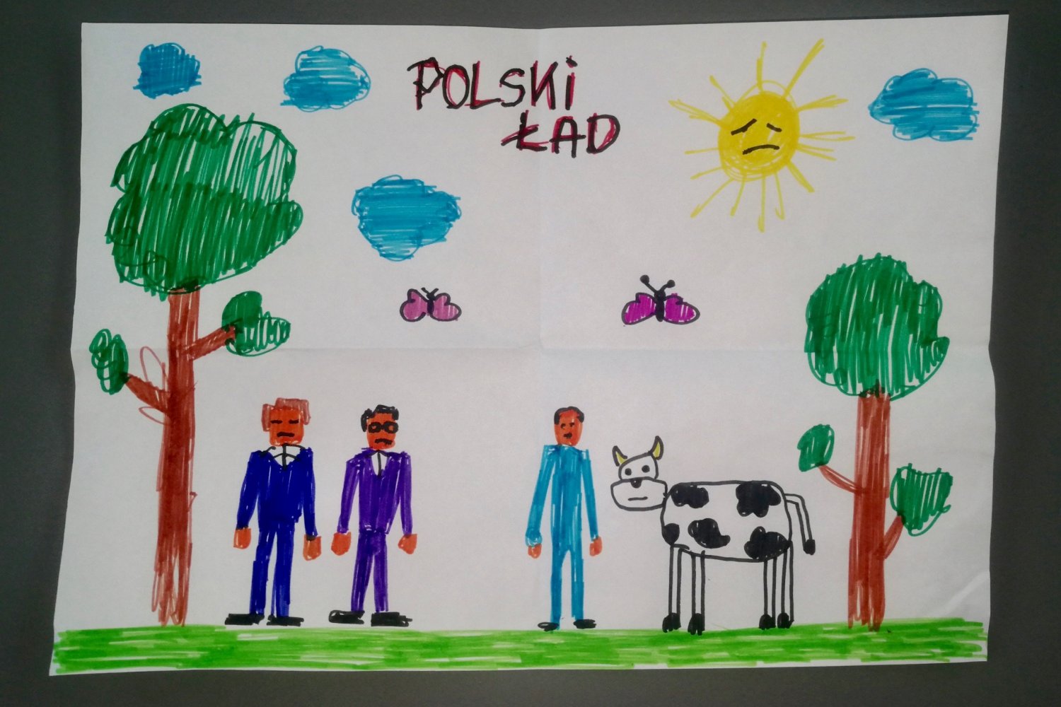 Na rysunku Zosi po lewej stronie widzimy dwóch dumnych i zadowolonych z siebie panów. Po prawej Zosia narysowała trzeciego pana oraz krówkę. Zosia widziała ten piękny obrazek w Telewizji Polskiej i pomyślała, że premierowi bardzo spodoba się jej praca.