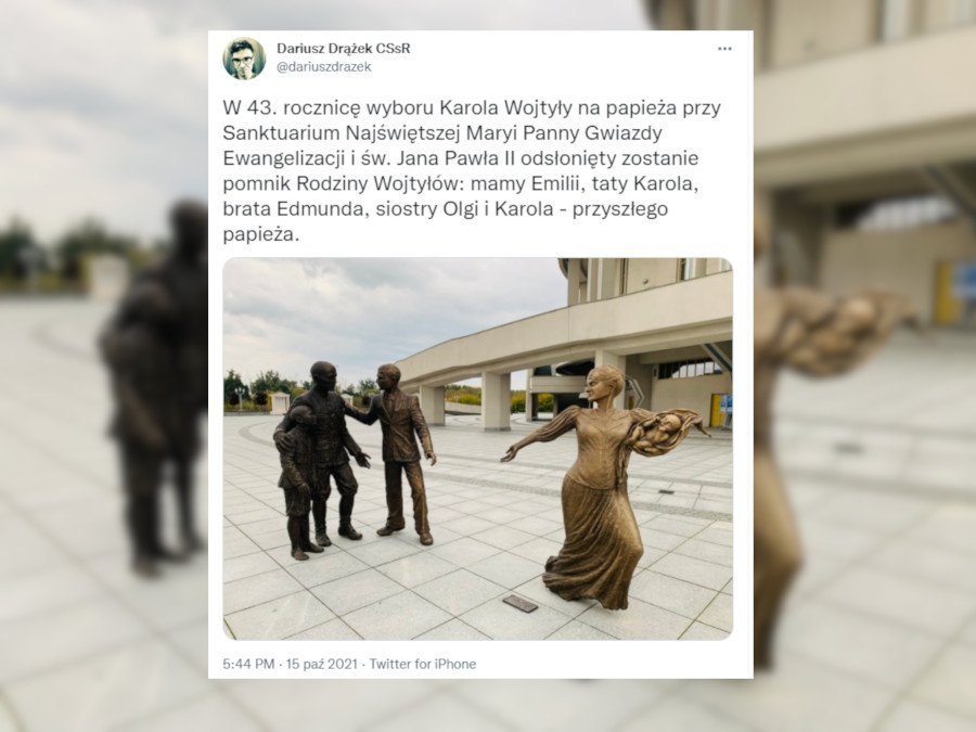 "W 43. rocznicę wyboru Karola Wojtyły na papieża przy Sanktuarium Najświętszej Maryi Panny Gwiazdy Ewangelizacji i św. Jana Pawła II odsłonięty zostanie pomnik Rodziny Wojtyłów: mamy Emilii, taty Karola, brata Edmunda, siostry Olgi i Karola - przyszłego papieża" czytamy we wpisie na Twitterze Dariusza Drążka.