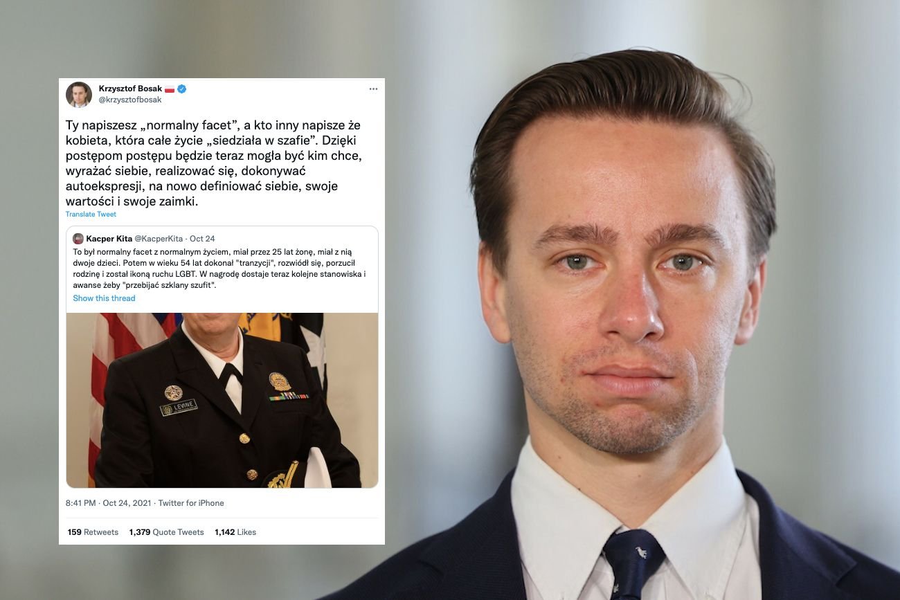 Cała sprawa zaczęła się od tego, że ktoś zamieścił post o Amerykance Rachel Levine - transpłciowej kobiecie, profesorce medycyny, a od niedawna czterogwiazdkowej admirałce. Oczywiście nazwał ją przy tym facetem i uznał, że jej awanse są niezasłużone. Na szczęście wtedy na białym koniu, owinięty w biało-niebiesko-różową flagę, wjechał Krzysztof Bosak.