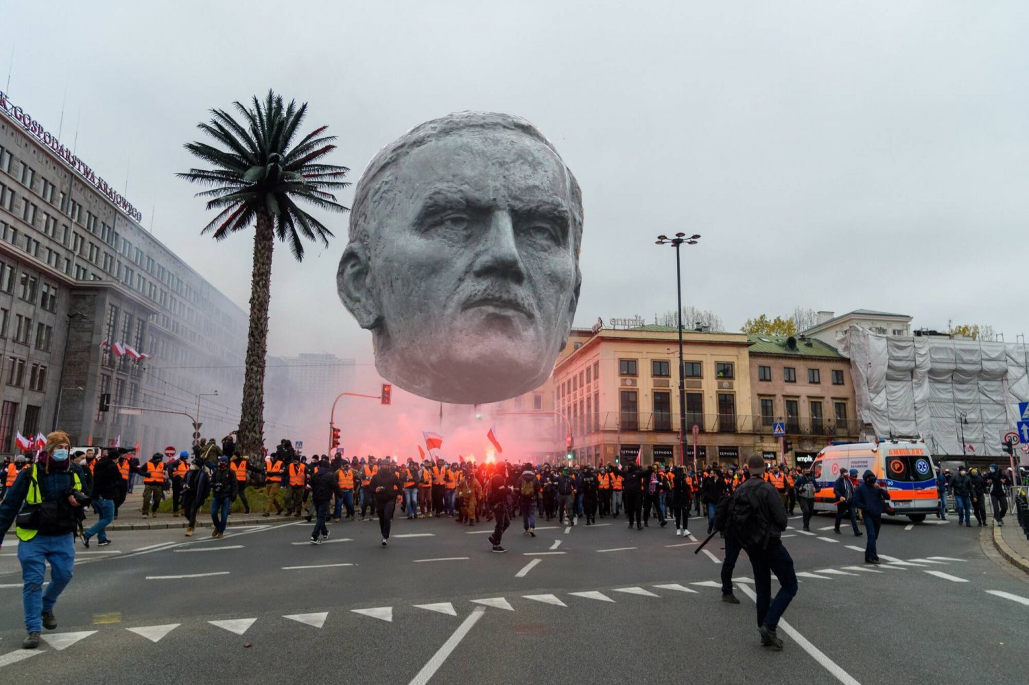 Słyszmy więc, że jego stopy miałyby się zaczynać już na Al. Jerozolimskich, a czubek głowy unosiłby się nad jego własnym rondem... rondem Dmowskiego. Piękne!