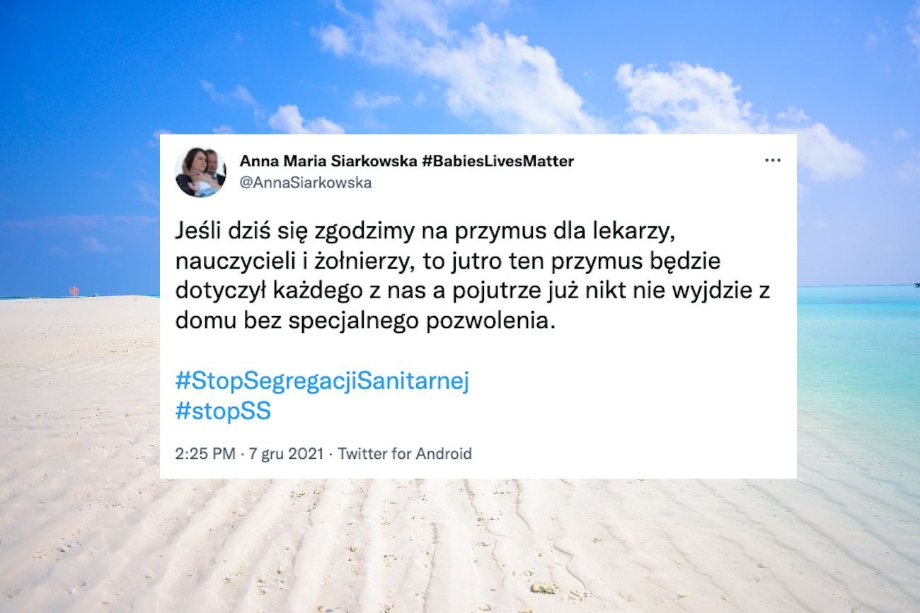 "Jeśli dziś się zgodzimy na przymus dla lekarzy, nauczycieli i żołnierzy, to jutro ten przymus będzie dotyczył każdego z nas a pojutrze już nikt nie wyjdzie z domu bez specjalnego pozwolenia" - napisała Siarkowska na Twitterze, a my zatrzymaliśmy się na chwilę podczas scrollowania i pogłaskaliśmy tego tweeta palcem.