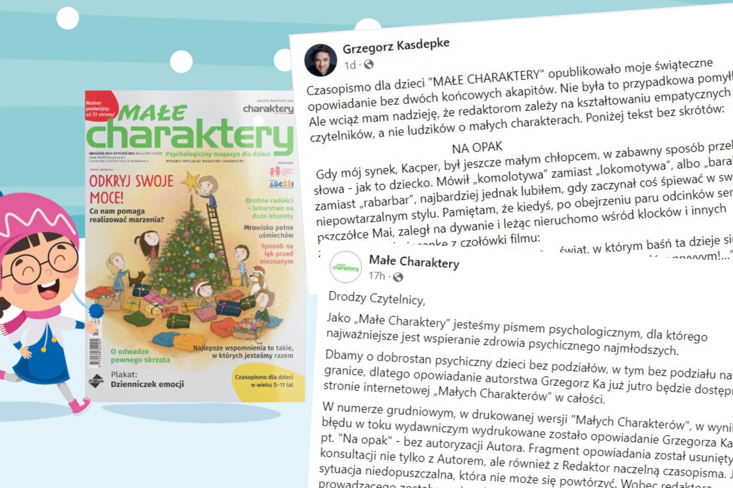 Pisarz i dziennikarz Grzegorz Kasdepke opublikował na Facebooku opowiadanie, które bez jego autoryzacji zostało wydrukowane w nieco zmienionej formie w grudniowym numerze czasopisma psychologicznego dla dzieci "Małe Charaktery". Przez przypadek z opowiadania zniknęła wzmianka o pomocy uchodźcom. Przez przypadek.