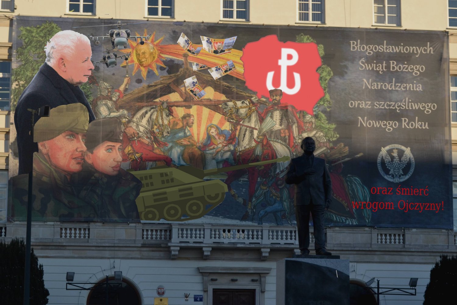 Udaliśmy się na pl. Józefa Piłsudskiego w Warszawie, by na własne oczy zobaczyć piękny bożonarodzeniowy billboard MON. Chociaż na miejscu zastaliśmy cudnie skąpane w promieniach słońca dzieło, coś nie pasowało. Czy husaria i żołnierze miały być jedynymi patriotycznymi akcentami przy szopce Jezusa? Naprawiliśmy to!