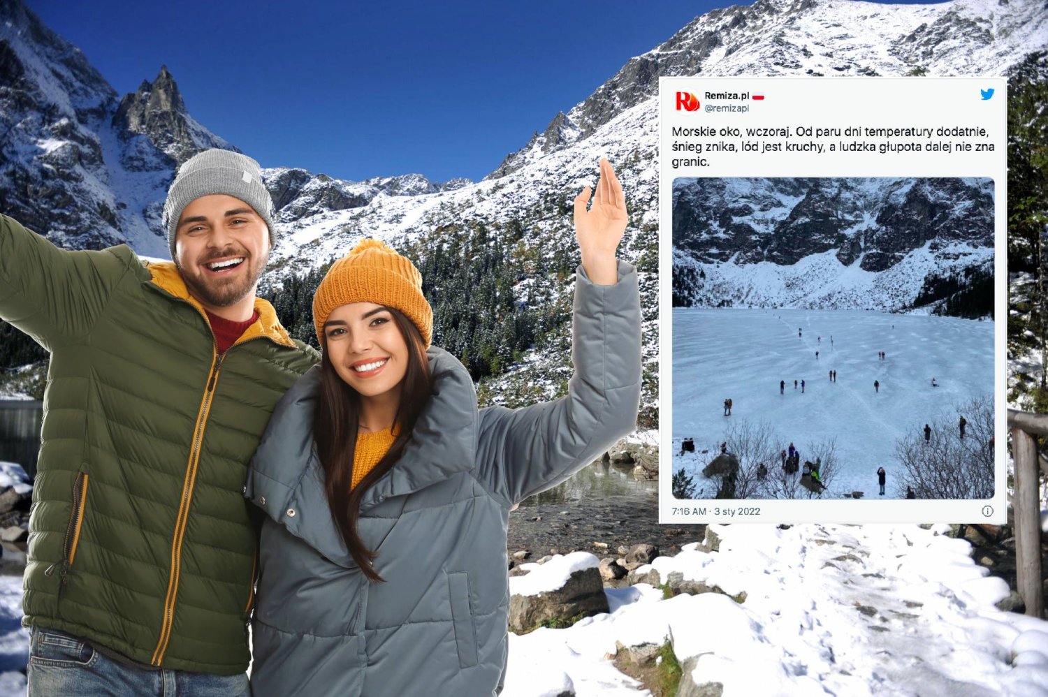 W twitterowym poście, który pojawił się na profilu Remiza.pl, serwisie o tematyce pożarniczej, możemy przeczytać: "Morskie oko, wczoraj. Od paru dni temperatury dodatnie, śnieg znika, lód jest kruchy, a ludzka głupota dalej nie zna granic" - do postu załączono też zdjęcie.