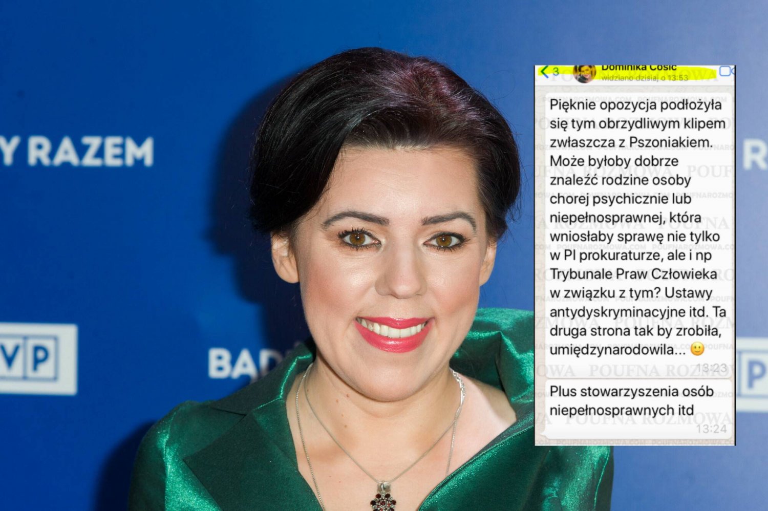 "Pięknie opozycja podłożyła się tym okropnym klipem zwłaszcza z Pszoniakiem. Może byłoby dobrze znaleźć rodzine osoby chorej psychicznie lub niepełnosprawnej, która wniosłaby sprawę nie tylko w Pl prokuraturze, ale i np Trybunale Praw Człowieka w związku z tym? Ustawy antydyskryminacyjne itd. Ta druga strona tak by zrobiła, umiędzynarodowila... Plus stowarzyszenia osób niepełnosprawnych itd" - napisała w malu Ćosić.