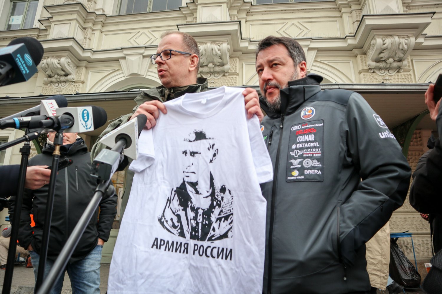 Salvini z jakiegoś powodu postanowił czym prędzej opuścić konferencję prasową. Koszulki nie chciał założyć. Dziwne!