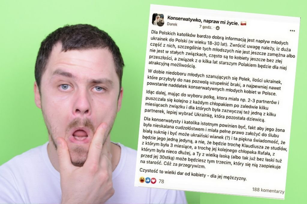 W dobie niedoboru szanujących się młodych Polek, napływ Ukrainek w wieku 18-30 lat, które nie zostały jeszcze skalane cudzołóstwem, jest naprawdę dobrą informacją. Tak przynajmniej uważa fejsbukowicz Darek, który w prywatnej, zamkniętej grupie "Konserwatywko, napraw mi życie" dzieli się swoimi przemyśleniami o korzyściach płynących z wojny w Ukrainie.