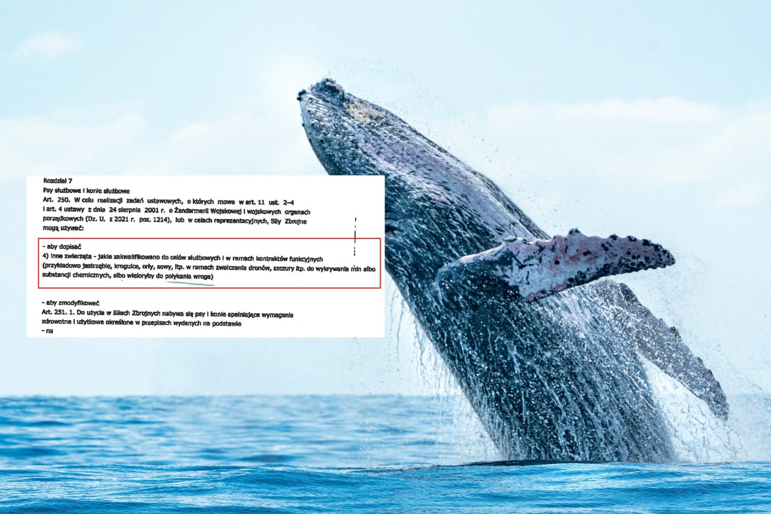 Ważna opinia na temat ustawy o obronie ojczyzny wpłynęła do Ministerstwa Obrony Narodowej. Ekspert (na pewno to ekspert, poznajemy po piśmie) zwraca uwagę, że oprócz psów czy koni, w polskiej armii powinny służyć także inne ssaki. W tym morskie. Na przykład walenie.