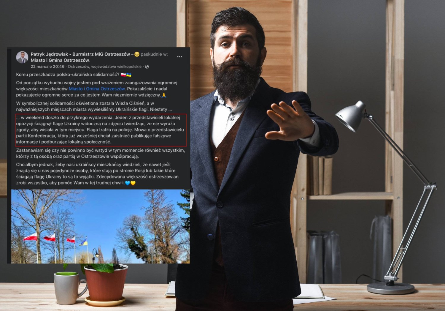 - W weekend doszło do przykrego wydarzenia - napisał burmistrz. - Jeden z przedstawicieli lokalnej opozycji ściągnął flagę Ukrainy widoczną na zdjęciu, twierdząc, że nie wyraża zgody, aby wisiała w tym miejscu. Flaga trafiła na policję. Mowa o przedstawicielu partii Konfederacja, który już wcześniej chciał zaistnieć, publikując fałszywe informacje i podburzając lokalną społeczność" - można przeczytać we wpisie.