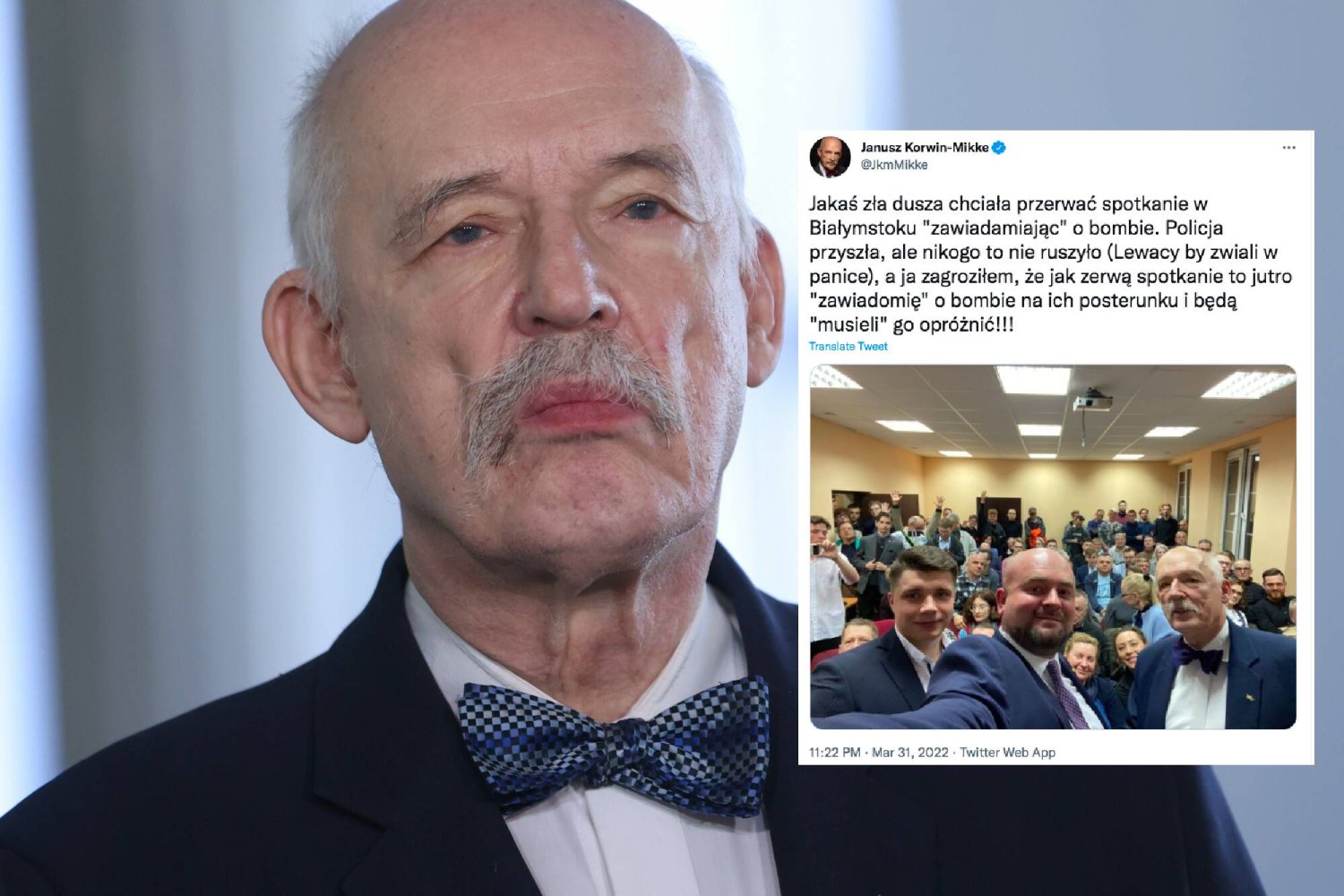 "Jakaś zła dusza chciała przerwać spotkanie w Białymstoku "zawiadamiając" o bombie. Policja przyszła, ale nikogo to nie ruszyło (Lewacy by zwiali w panice), a ja zagroziłem, że jak zerwą spotkanie to jutro "zawiadomię" o bombie na ich posterunku i będą "musieli" go opróżnić!!!" - czytamy we wpisie lidera Konfederacji.