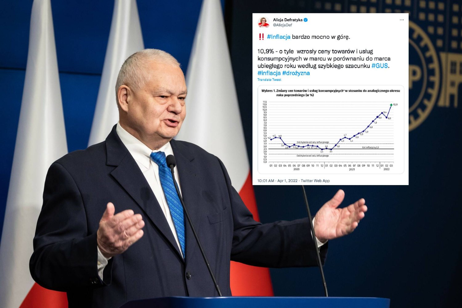 "10,9% - o tyle wzrosły ceny towarów i usług konsumpcyjnych w marcu w porównaniu do marca ubiegłego roku według szybkiego szacunku GUS" - czytamy we wpisie Alicji Defratyki, ekonomistki.