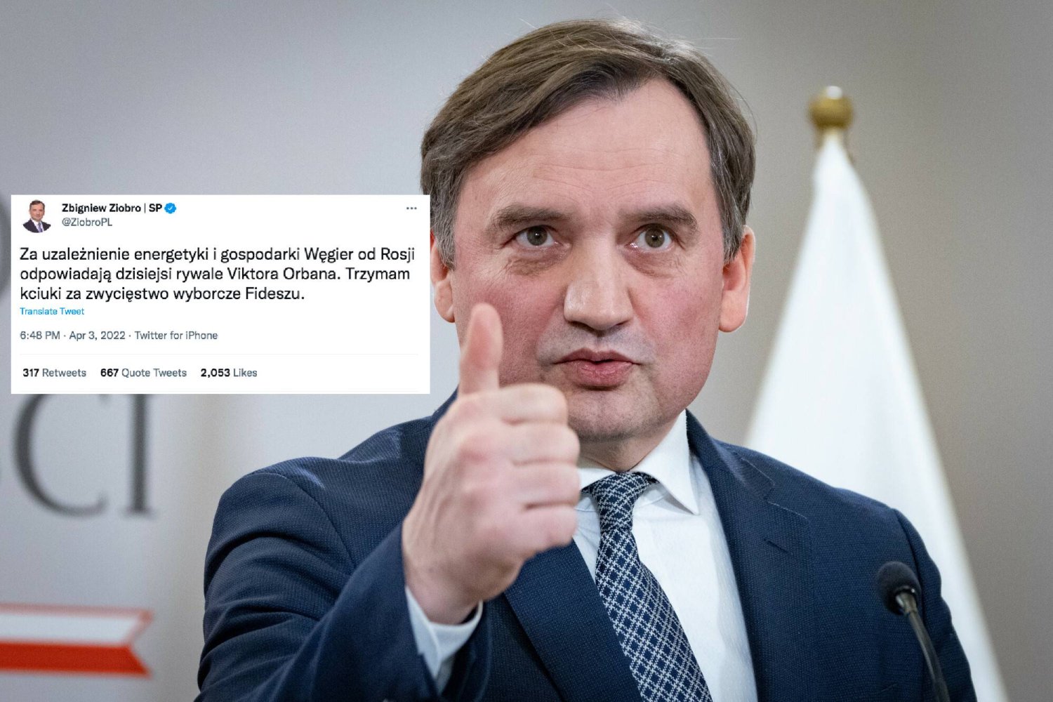 - Za uzależnienie energetyki i gospodarki Węgier od Rosji odpowiadają dzisiejsi rywale Viktora Orbana. Trzymam kciuki za zwycięstwo wyborcze Fideszu - napisał na swoim Twitterze minister sprawiedliwości.
