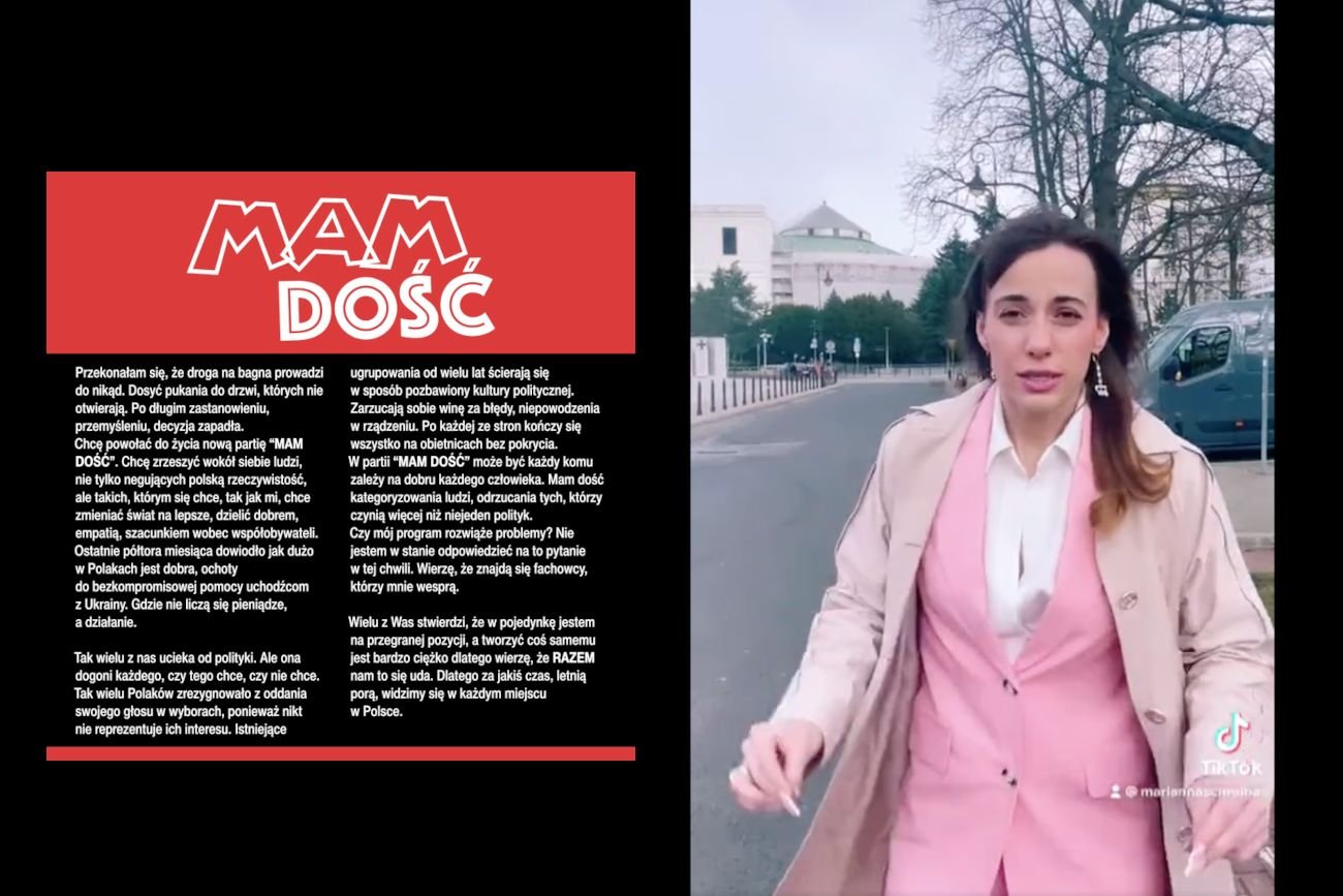 "Partia MAM DOŚĆ przełamie te wieczne kłamstwa, puste obietnice, wieczne przepychanki lewicy z prawicą. My mamy tego dość. Chcemy nowości, chcemy prawdy, chcemy właściwych rozwiązań" - mówi Marianna Schreiber. Jak dodaje, partia "to coś między lewicą a prawicą", co brzmi jasno, konkretnie i od razu wiadomo, o co chodzi: o to, że mamy dość.