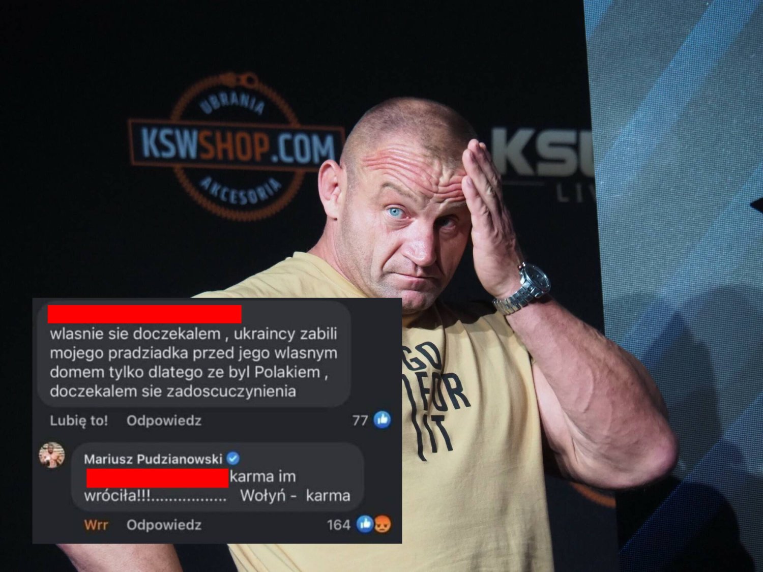 - Właśnie się doczekałem, Ukraińcy zabili mojego pradziadka przed jego własnym domem tylko dlatego, że był Polakiem, doczekałem się zadośćuczynienia - napisał na Facebooku komentator najwyraźniej cieszący się z cierpienia i śmierci obywateli Ukrainy. - Karma im wróciła!!! Wołyń - karma - odpisał w komentarzu Mariusz Pudzianowski.