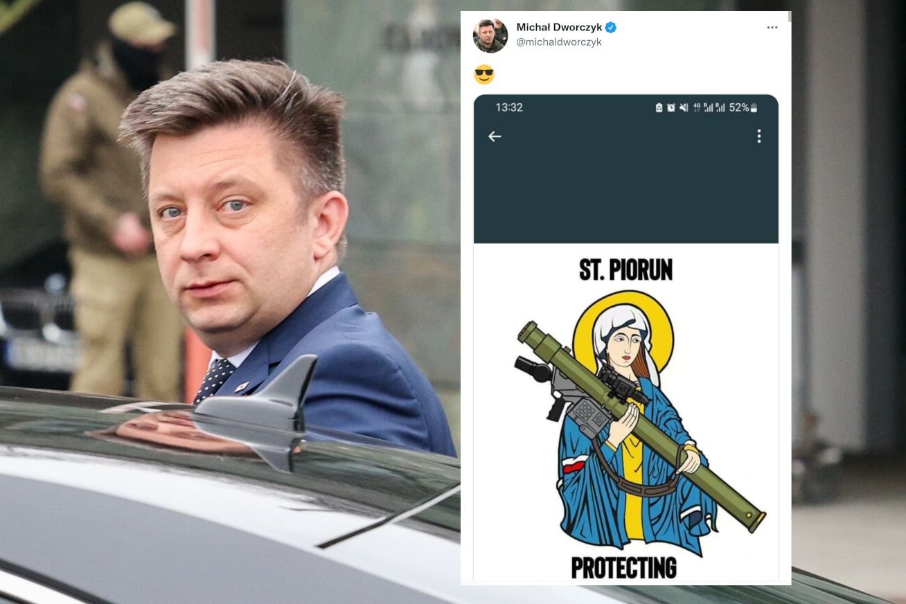 Matka Boska Michała Dworczyka ubrana jest w barwy ukraińskiej flagi, na ramieniu ma polską opaskę, a w dłoniach trzyma rakietnicę PPZR Piorun do strącania samolotów i dronów. To dobry polski produkt, więc zapewne dlatego minister jest tak dumny z tej grafiki.