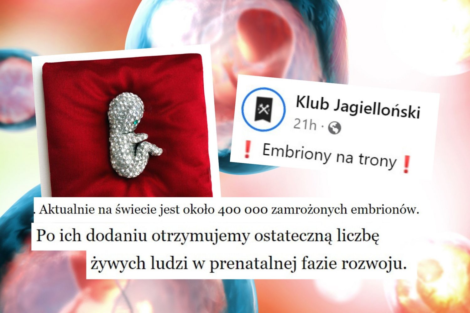 "Płody nie wyglądają jak mandarynki, pierożki ani galaretki. Potrzebujemy realizmu płodowego i przyswojenia wiedzy z embriologii i psychologii prenatalnej" – oznajmił na Facebooku Klub Jagielloński, jako przykład takiego realizmu podając zdobioną kryształkami figurkę w kształcie uroczego płodka leżącą na satynowej poduszeczce.
