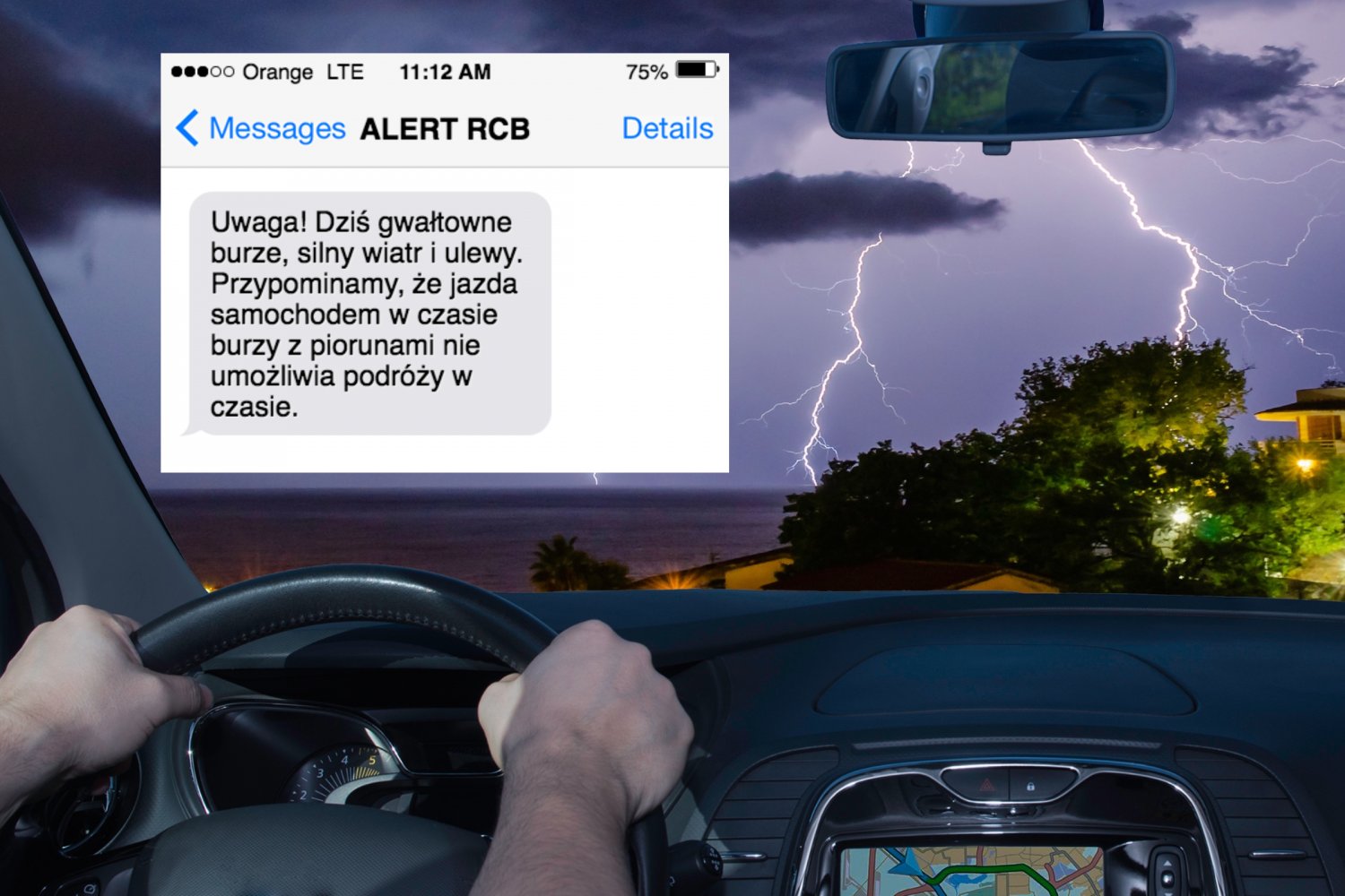 Ostrzeżenie dla kierowców. Rządowe Centrum Bezpieczeństwa przypomina, że gwałtowne burze oraz silne wyładowania atmosferyczne nie są odpowiednimi warunkami do brawurowej jazdy i podróży w czasie.