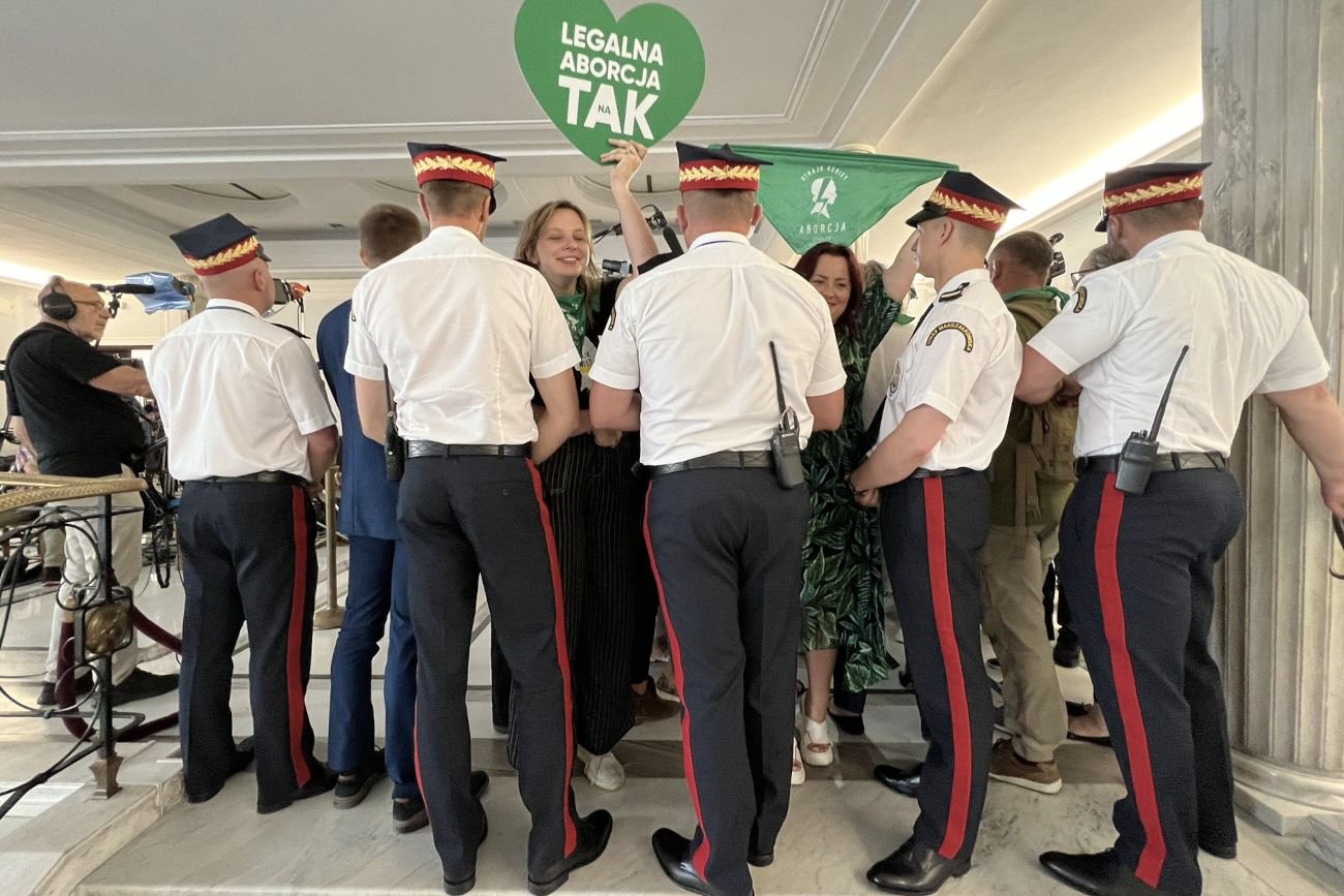 Fotografia pokazuja też wyraźnie, że straż marszałkowska nie stoi przy działaczkach Legalnej Aborcji ot, tak sobie. Przeciwnie - funkcjonariusze własnymi ciałami oddzielają panie od groźnych schodów. W emocjach mogłyby zapewne wbiec na nie, spaść i coś sobie złamać. To dobrze, że przed tego rodzaju nieszczęściem chroni je szczelny kordon mundurowych.