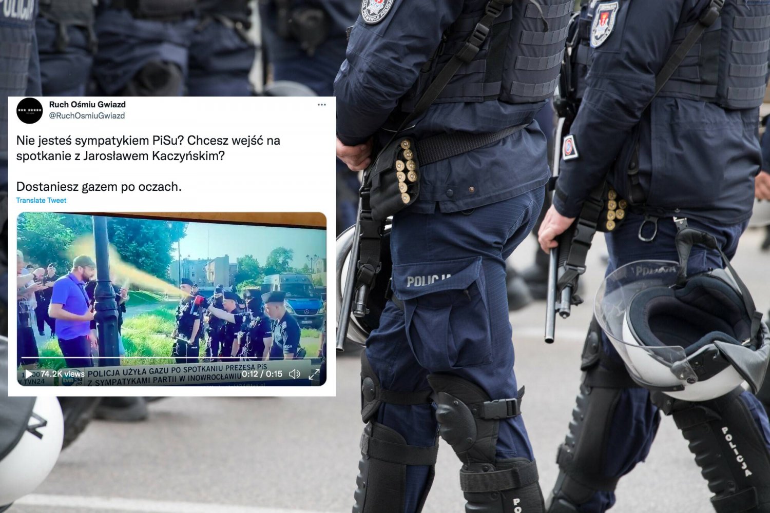 Miły gest policjanta. Osoby, których nie wpuszczono na spotkanie z Jarosławem Kaczyńskim w Inowrocławiu, nie skończyły z ranami postrzałowymi w ciele, a jednie z gazem na twarzy. Bohater, jakiego potrzebujemy?