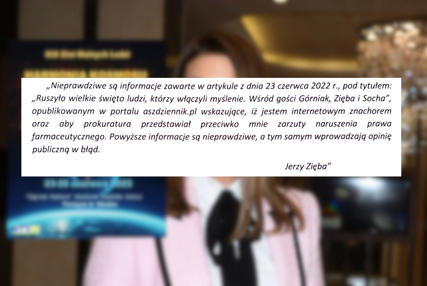 "Nieprawdziwe są informacje zawarte w artykule z dnia 23 czerwca 2022 roku, pod tytułem "Ruszyło wielkie święto ludzi, którzy włączyli myślenie. Wśród gości Gorniak, Zięba i Socha", opublikowanym w portalu ASZdziennik.pl wskazujące, iż jestem internetowym znachorem oraz aby prokuratura przedstawiał przeciwko mnie zarzuty naruszenia prawa farmaceutycznego. Powyższe informacje są nieprawdziwe, a tym samym wprowadzają opinię publiczną w błąd.
