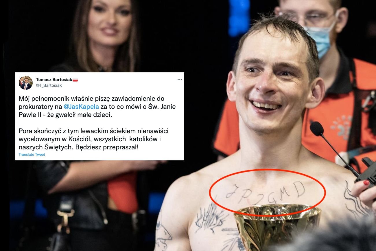 "Mój pełnomocnik właśnie piszę zawiadomienie do prokuratory na @JasKapela za to co mówi o Św. Janie Pawle II - że gwałcił małe dzieci. Pora skończyć z tym lewackim ściekiem nienawiści wycelowanym w Kościół, wszystkich katolików i naszych Świętych. Będziesz przepraszał!" - napisał Bartosiak.