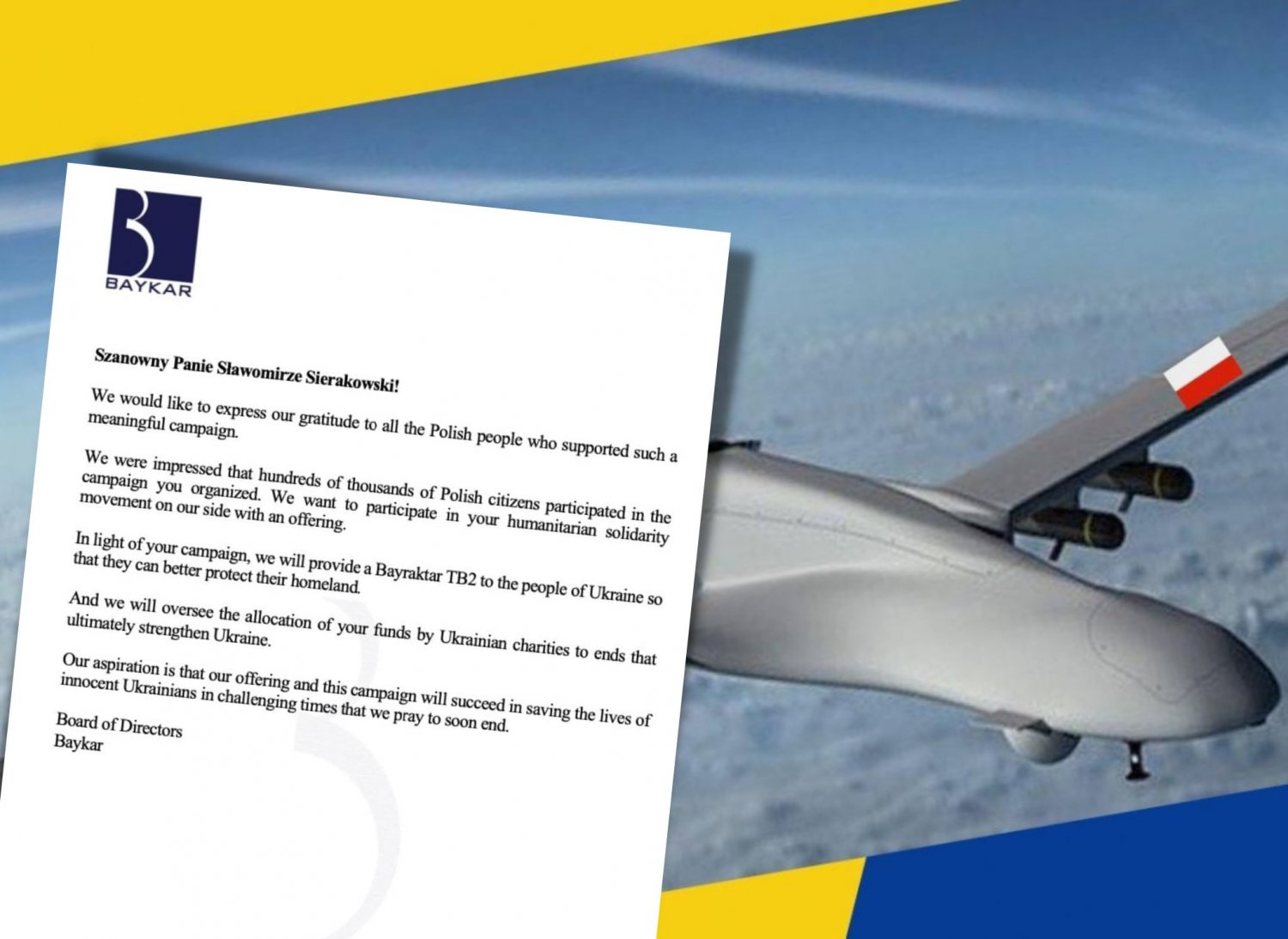 "W obliczu pana kampanii, przekażemy dron Bayraktar TB2 Ukraińcom bezpłatnie, aby mogli jak najlepiej bronić swojej ojczyzny. Będziemy też nadzorować przeznaczenie zebranych funduszy przez ukraińskie organizacje charytatywne na cele, które służą wzmacnianiu Ukrainy" – napisano w liście podpisanym przez Radę Dyrektorów firmy Baykar.