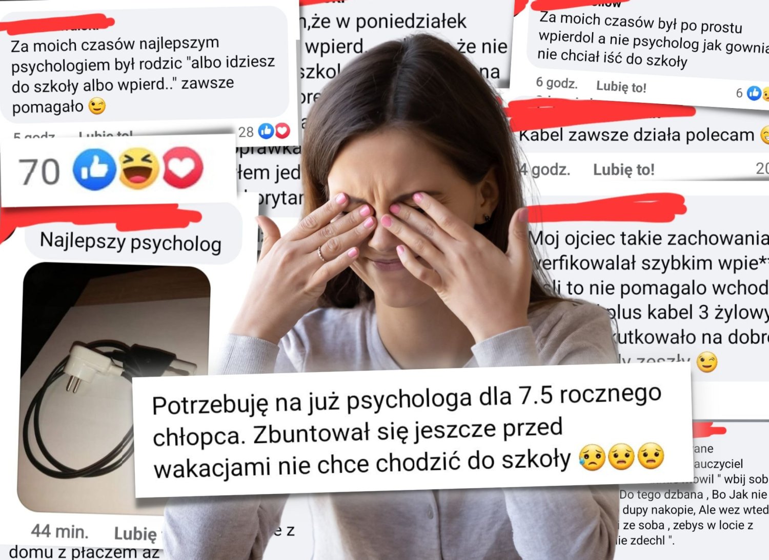 Wśród komentarzy znalazły się między innymi: zdjęcie kabla z podpisem "Najlepszy psycholog", historie o skutecznej przemocy z własnego dzieciństwa oraz, oczywiście, rozpoznawanie źródła wszelkich problemów w BeZsTreSoWym WycHoWaNiU.