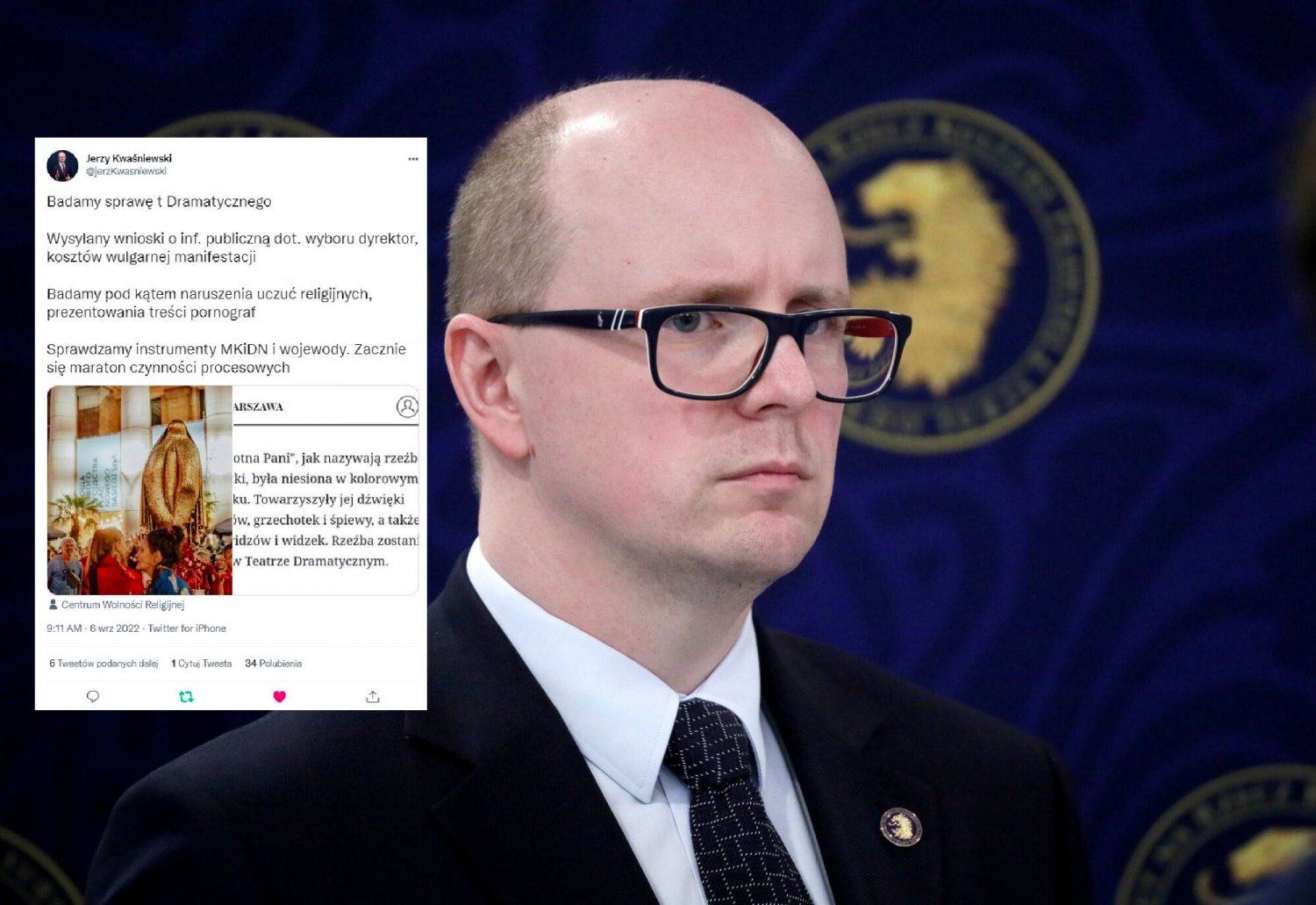 Ordo Iuris podejmuje kroki wyjaśniające względem "Wilgotnej Pani" - rzeźby, która stanęła w Teatrze Dramatycznym w Warszawie. - Badamy pod kątem naruszenia uczuć religijnych, prezentowania treści pornograf (oryg. pisowania - przyp. ASZ) - czytamy we wpisie Jerzego Kwaśniewskiego, prezesa Ordo Iuris.