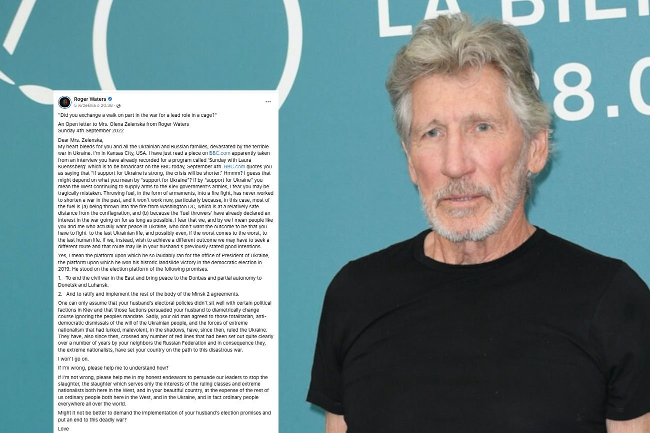 Kto najlepiej zna się na wojnie w Ukrainie, imperialistycznej polityce Rosji oraz małżeństwie państwa Zełenskich? Naturalnie Brytyjczyk Roger Waters z Pink Floydów. Muzyk wystosował na Facebooku list otwarty do Ołeny Zełenskiej, w którym tłumaczy, żeby zamiast prosić o pomoc dla Ukrainy powiedziała mężowi ("your old man"), żeby się poddał i będzie git.